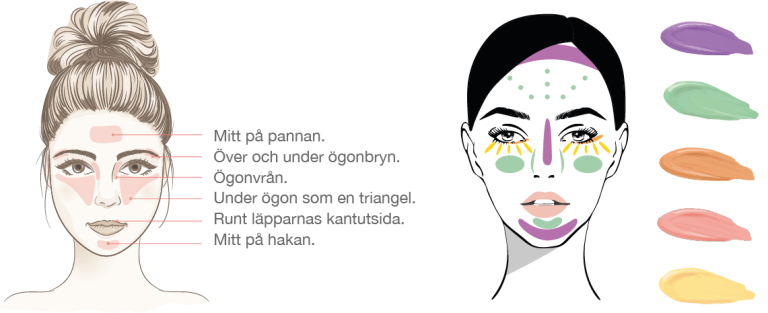 Grön färg neutraliserar rödhet. Gult döljer blåa toner och lila passar för synliga vener och mörka ringar.