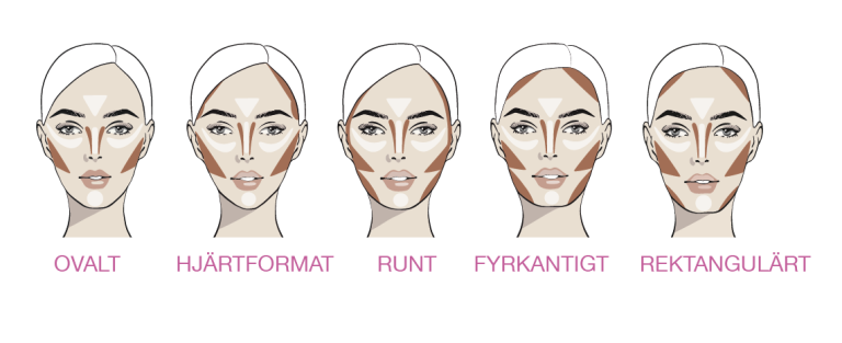 Beroende på olika ansiktsformer kan man enkelt lägga konturer och framhäva genom att ljusa upp, se nedan bild. Mörka toner skapar konturerna enligt bild och för att ljusa upp och framhäva se ljusare toner. Anpassa efter din ansiktsform.